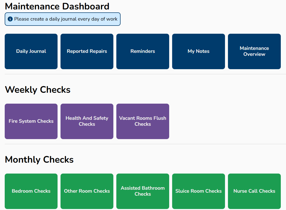 Dashboards and functionality for all user types, including maintenance, management, general staff, housekeeping & more.